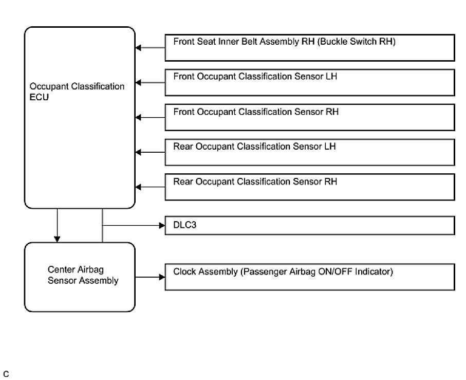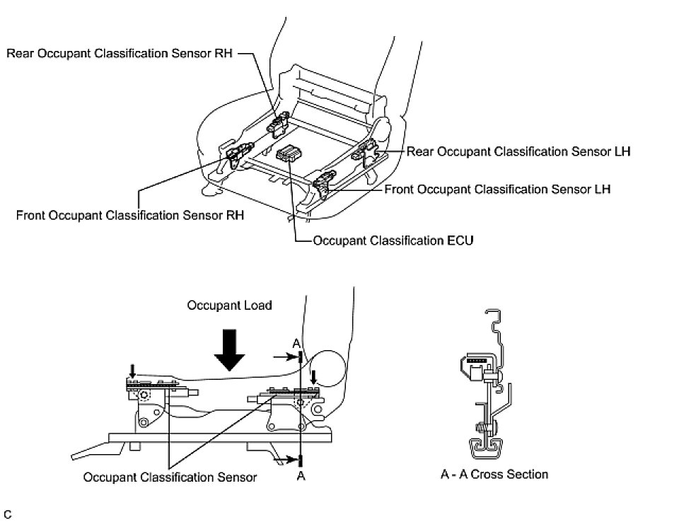 (1) In the occupant classification system, the occupant classification ECU calculates the weight of the occupant based on a signal from the occupant classification sensors. This system recognizes the occupant to be a child if it detects a weight of less than 36 kg (79.37 lb), and disables the front passenger airbag and front passenger side-side airbag.