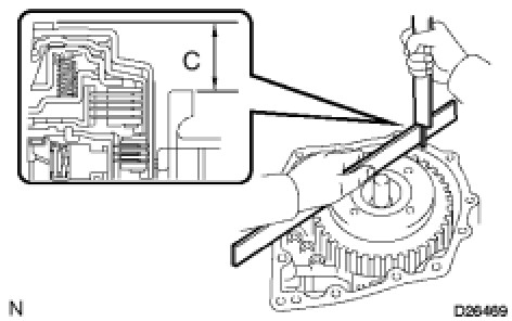 (d) As shown in the illustration, place a straight edge on the direct clutch drum and measure the distance between transaxle case and the straight edge using vernier calipers (Dimension C).