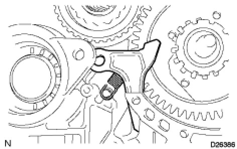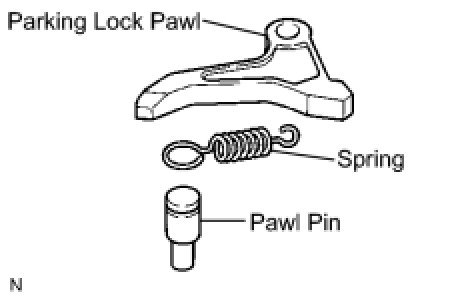 (b) Temporarily install the parking lock pawl, shaft and spring to the transaxle case, as shown in the illustration.