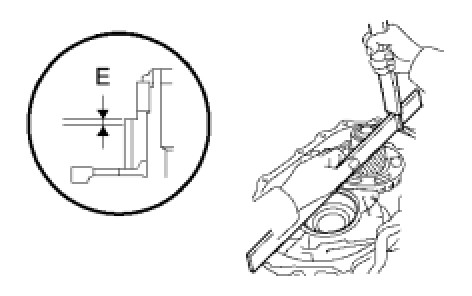 (d) Using a straight edge and vernier calipers as shown in the illustration, measure the gap between the top of the differential drive pinion in the underdrive planetary gear and contact surface of the transaxle case and housing (Dimension E).