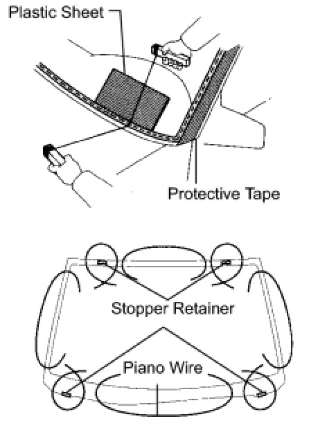 (b) From the interior, insert piano wires between the vehicle body and windshield glass as shown in the illustration.