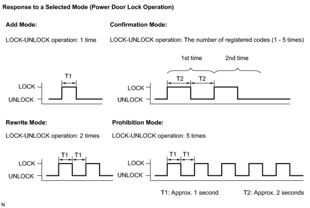 (8) The body ECU automatically performs the power door LOCK-UNLOCK operation within 3 seconds after the mode has been selected and informs the technician of the selected mode using the following response patterns.
