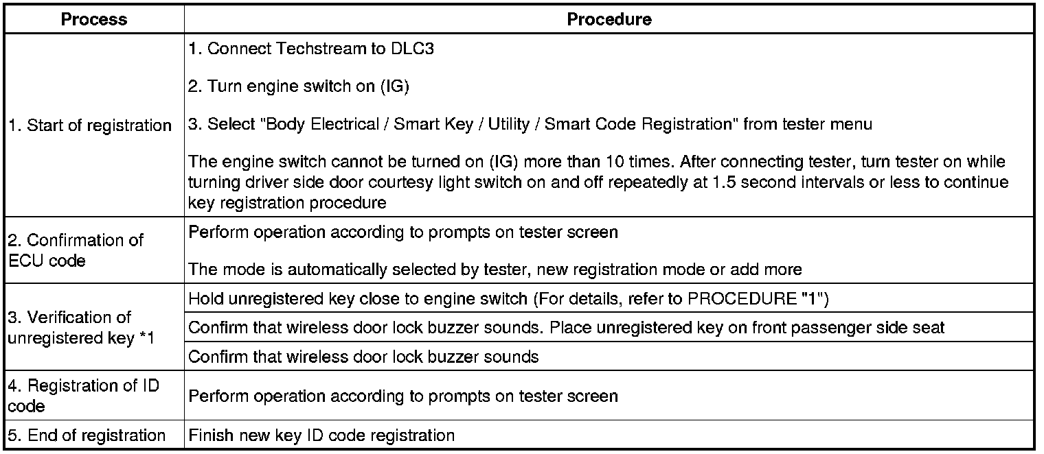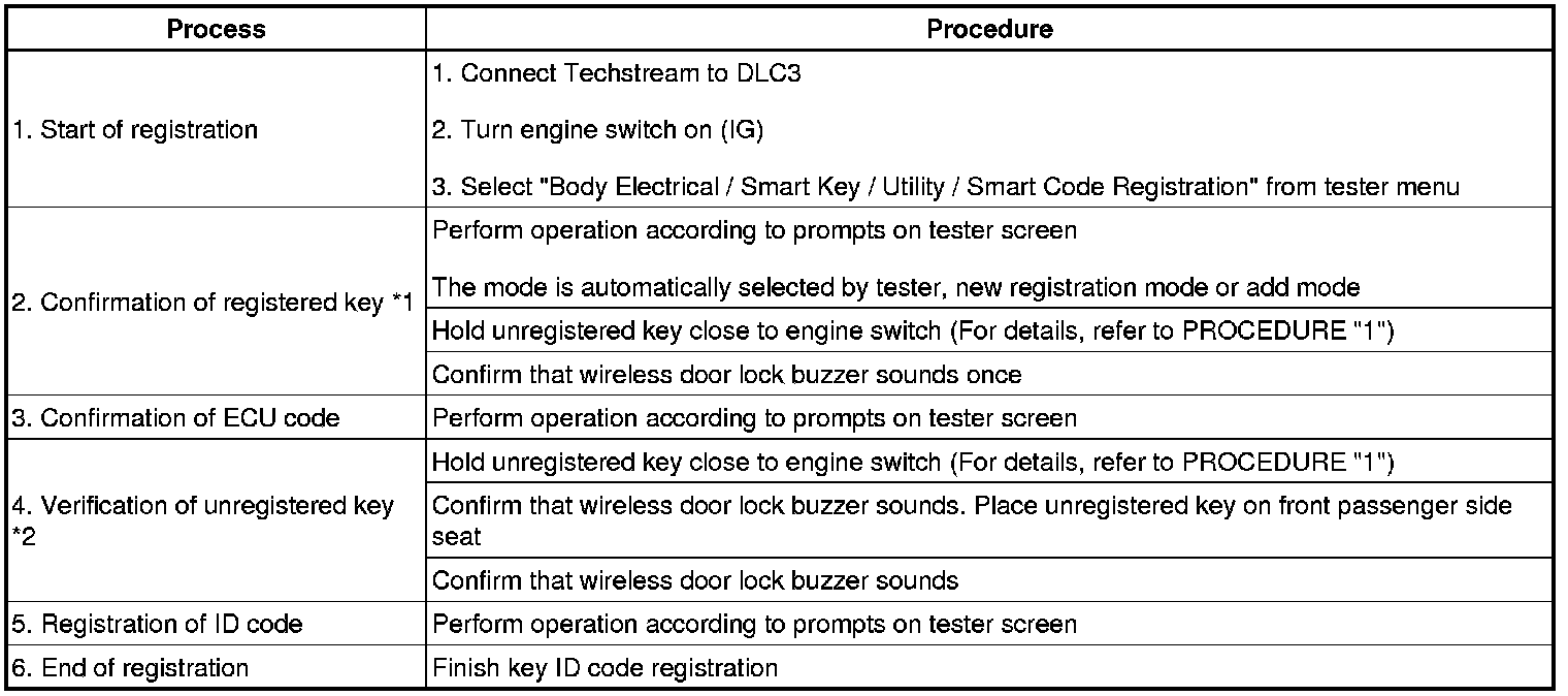 *1: Perform this process for one of the keys registered for the vehicle. Finish the procedure within 30 seconds. If the procedure has not been finished within the specified time, perform registration procedures from process 1 again.