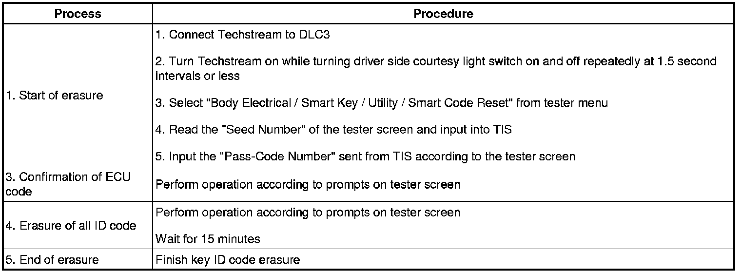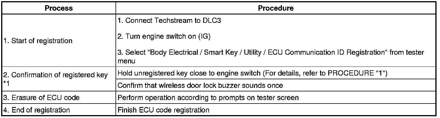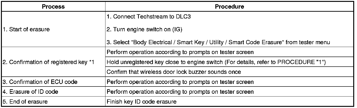 *1: Perform this process for one of the keys registered for the vehicle. Finish the procedure within 30 seconds. If the procedure has not been finished within the specified time, perform erasure procedures from process 1 again.
