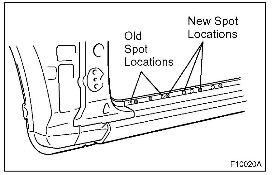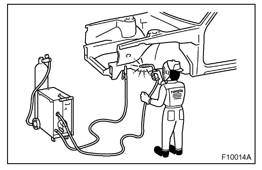 2. Plug welding should be done with a MIG (Metal Inert Gas) welder. Do not gas weld or braze panels at areas other than specified.