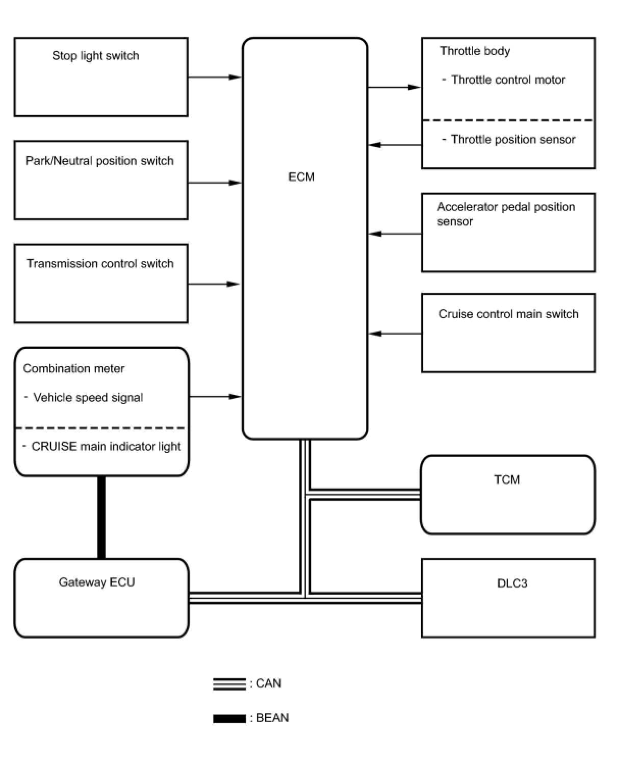 - The ECM receives signals such as ON-OFF, -/SET, +/RES, and CANCEL from the cruise control main switch assembly and executes them.