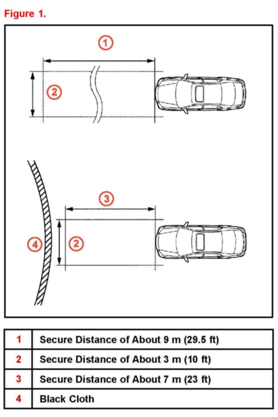 ^ Check that there are no reflective materials in the surroundings or on the ground. If you cannot secure a distance of about 29.5 ft (9 m) in front of the vehicle, be sure to secure at least 23 ft (7 m) from the vehicle and cover the area with a black cloth (see figure 1). If NOT covered with a black cloth, the laser sensor may detect something other than the target and it will fail to adjust properly.