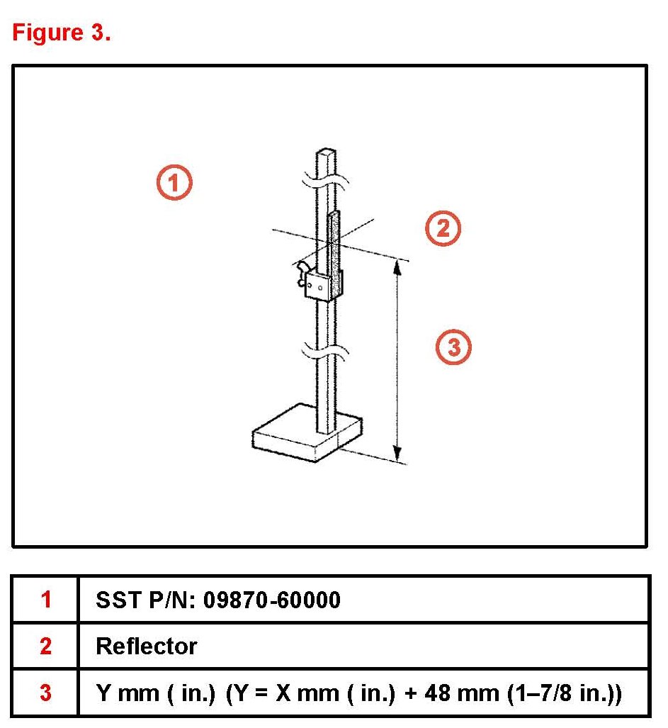 B. Adjust the center height of the reflector (SST P/N: 09870-60000) 48 mm (1-7/8 in.) higher than the measurement taken for the center of the luminous portion of the laser sensor.