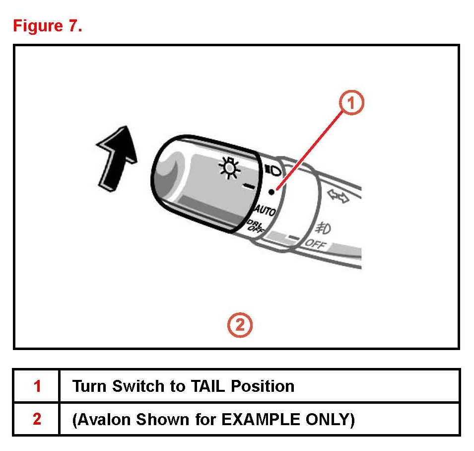 13. Turn the headlight dimmer switch from the OFF position to the TAIL position (e.g., parking, tail, license plate, side marker, and instrument panel lights) while the "LASER CRUISE DIVERGENCE DATA" screen is still shown on the Techstream.