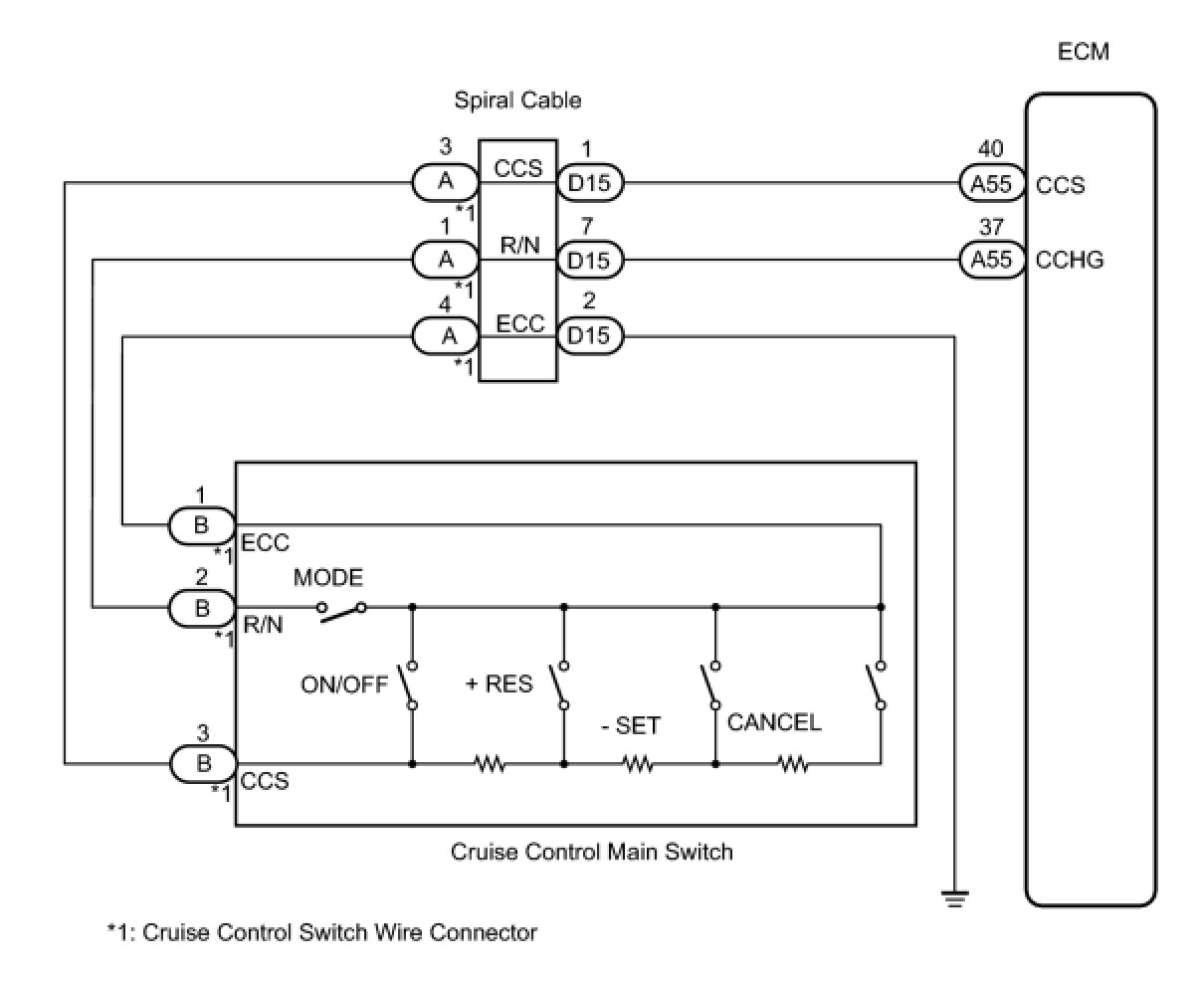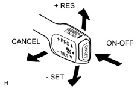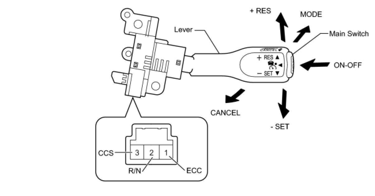 The cruise control main switch operates 8 functions: SET, COAST, TAP-DOWN, RESUME, ACCEL, TAP-UP, CANCEL and MODE. The SET, TAP-DOWN and COAST functions, and the RESUME, TAP-UP and ACCEL functions are operated with the same switch. The cruise control main switch is an automatic return type switch which turns on only while operating it in each arrow direction and turns off after releasing it. The internal contact point of the cruise control main switch is turned on with the switch operation. The ECM then reads the resistance value that has been changed by the switch operation to control MODE, SET, COAST, RESUME, ACCEL and CANCEL. The dynamic laser cruise control system has two cruise control modes: the constant speed control mode and vehicle-to-vehicle distance control mode.