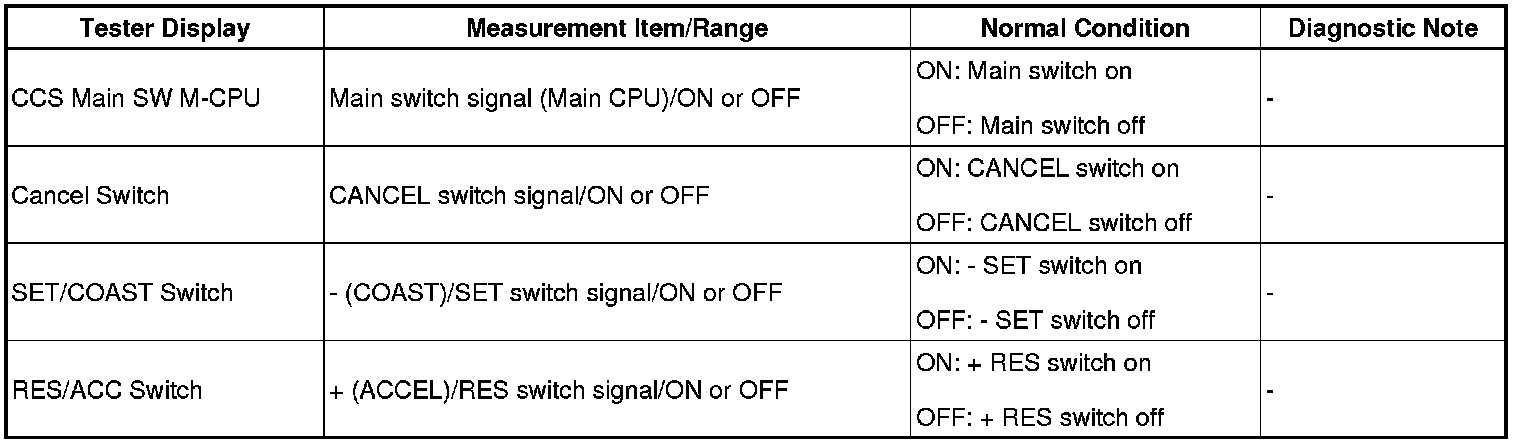 (e) Check the Data List for proper functioning of the cruise control main switch.