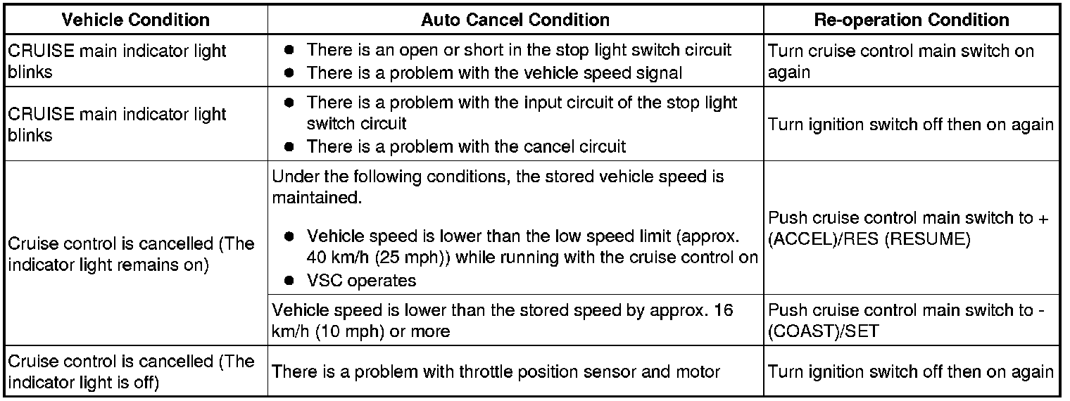 HINT: If the following conditions are detected while the cruise control is in operation, the system clears the stored vehicle speed in the ECM and cancels the cruise control operation.