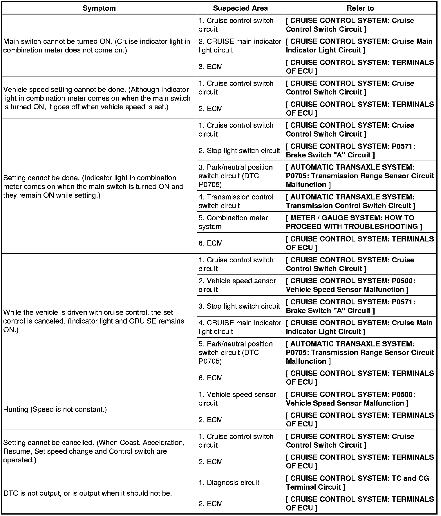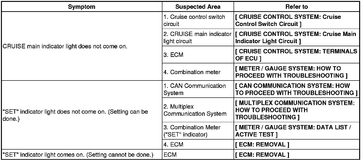 CRUISE CONTROL: CRUISE CONTROL SYSTEM: PROBLEM SYMPTOMS TABLE