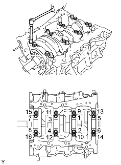 Install and uniformly tighten the 16 crankshaft bearing cap bolts in the sequence shown in the illustration.