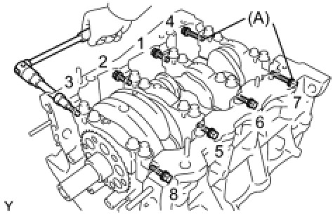 Install and uniformly tighten the 8 main bearing cap bolts in several steps and in the sequence shown in the illustration.