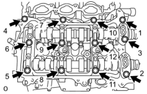 (a) Uniformly loosen and remove the cylinder head set bolts in the sequence shown in the illustration.