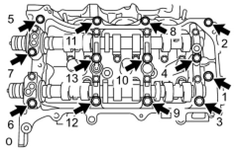 (d) Uniformly loosen and remove the 13 bearing cap bolts in the sequence shown in the illustration.