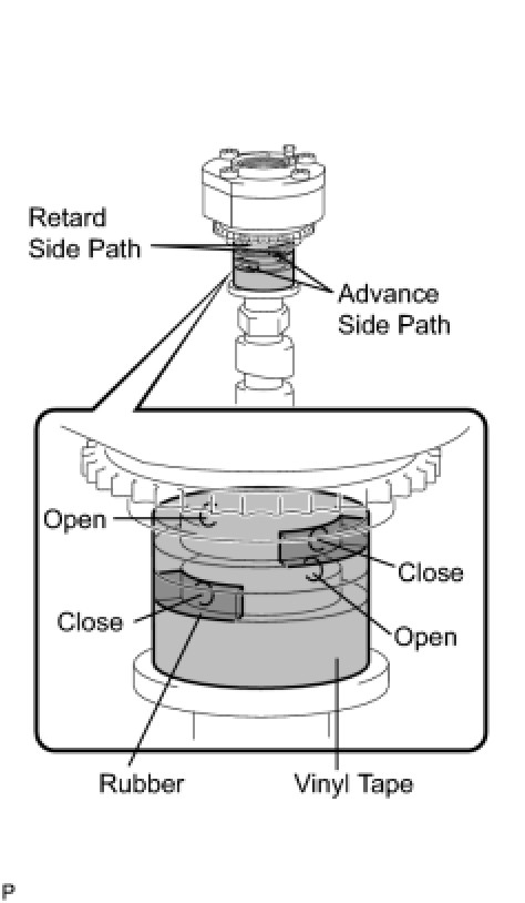 (4) Make sure that the camshaft timing exhaust gear turns in the retard direction when reducing the air pressure applied to the advance side path.
