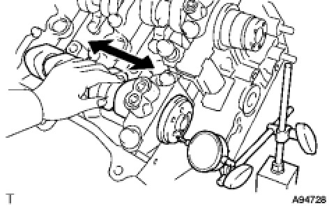 (d) Using a dial indicator, measure the thrust clearance while moving the camshaft back and forth.