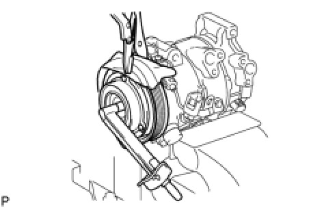 (d) Using a snap ring expander, install the magnetic clutch rotor and a new snap ring with the chamfered side facing up.