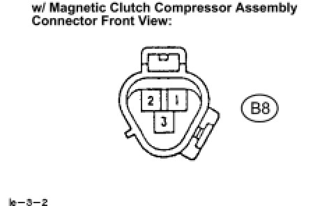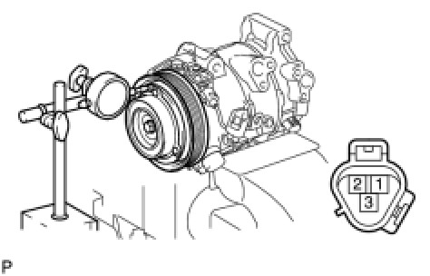 (b) Connect the battery positive lead to terminal 3 of the magnetic clutch connector and the negative lead to the earth wire. Turn on and off the magnetic clutch and measure the clearance.