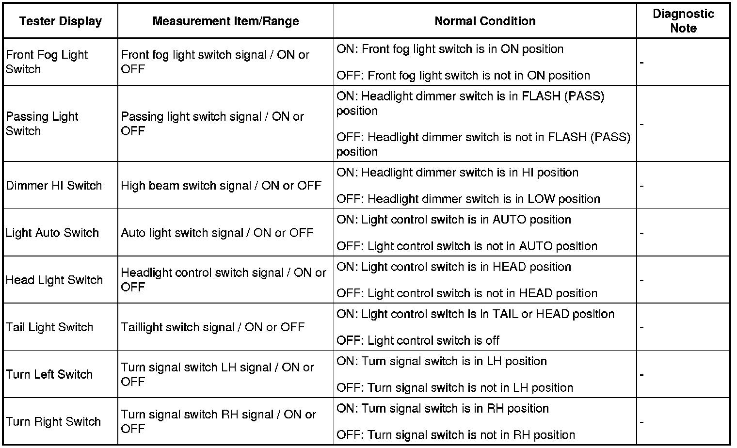 (d) Enter the following menus: Body Electrical / Combination Switch / Data List.