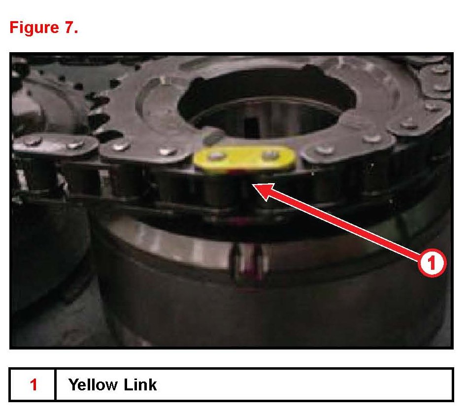 2. If NEW camshaft timing gears or the No. 2 timing chain are being installed the two yellow links on the No. 2 timing chain can be used to ensure correct relationship between the intake timing gear and the exhaust timing gear.