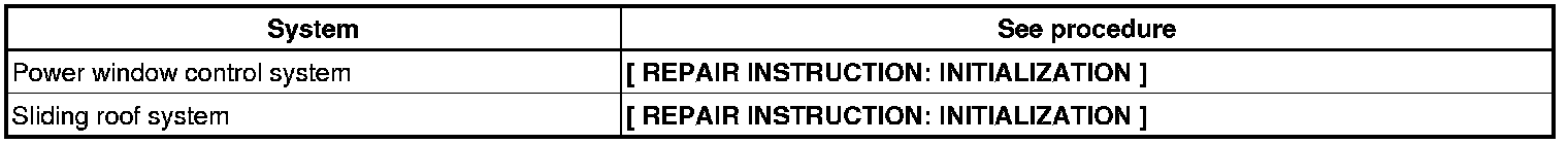 NOTE: When disconnecting the battery negative (-) terminal, initialize the following systems after the terminal is reconnected: