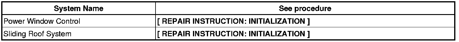 NOTE: When disconnecting the negative (-) battery cable, initialize the following system after the cable is reconnected.