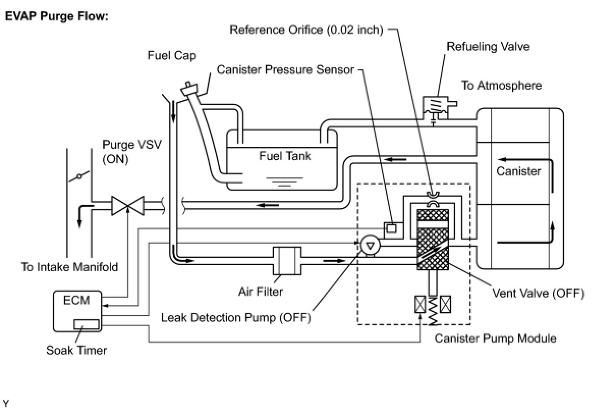 While the engine is running and the purge VSV (Vacuum Switching Valve) is ON (open), the ECM monitors the purge flow by measuring the EVAP pressure change. If negative pressure is not created, the ECM begins the 2nd monitor.