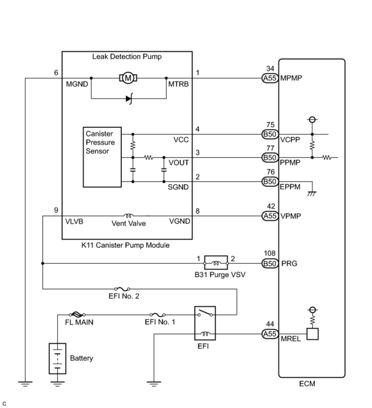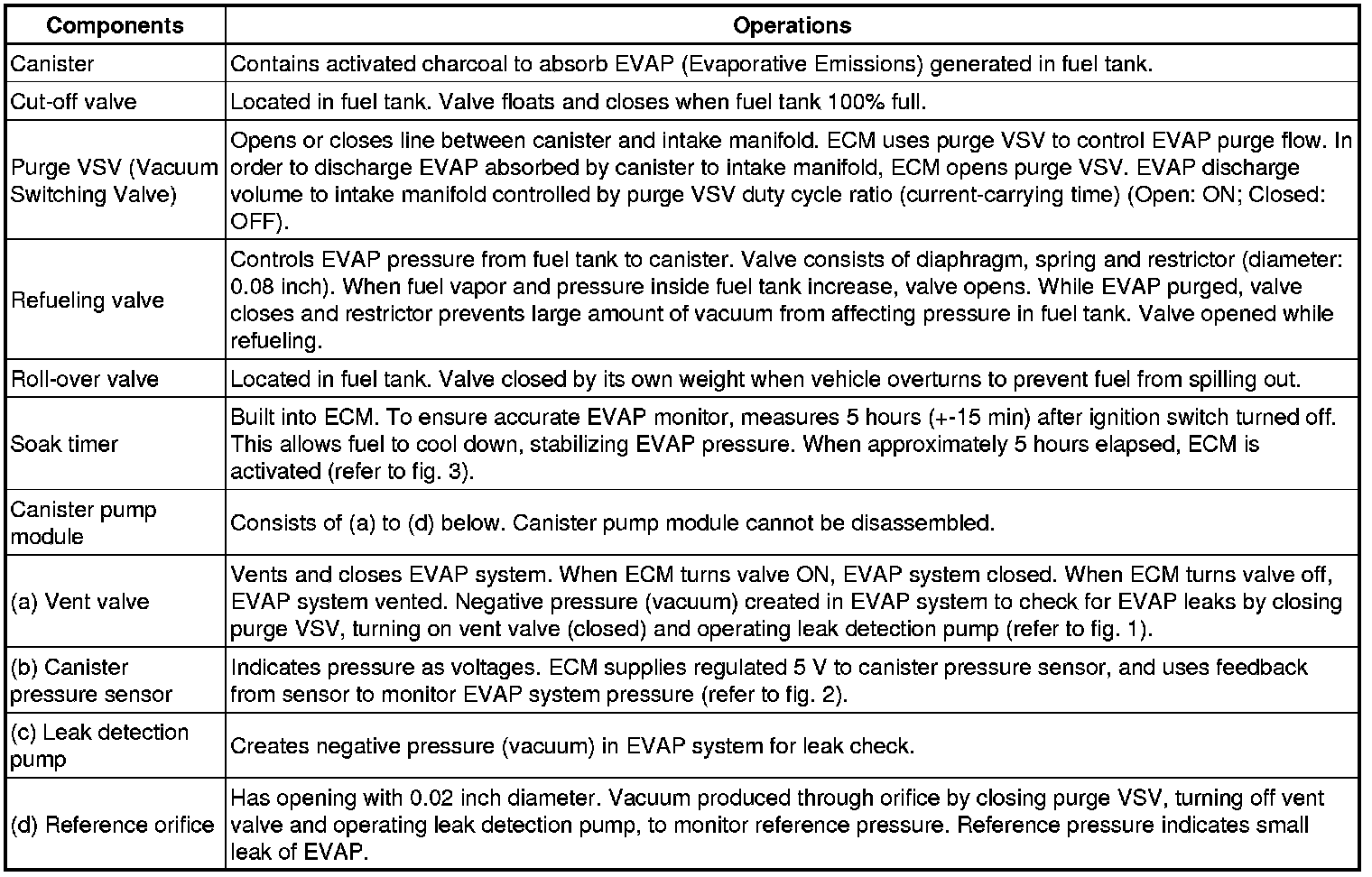 The leak detection pump creates negative pressure (vacuum) in the EVAP system and the pressure is measured. Finally, the ECM monitors for leaks from the EVAP system, malfunctions in both the canister pump module and purge VSV, based on the EVAP pressure.