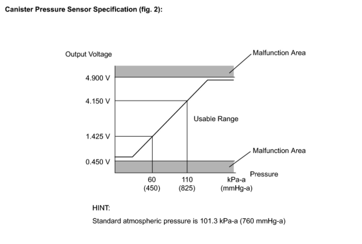 The vent valve is turned OFF (open) and the EVAP pressure is measured. If the variation in the pressure is less than 0.5 kPa-g (3.75 mmHg-g), the ECM interprets this as the purge VSV being stuck closed, illuminates the MIL and sets DTC P0441 (2 trip detection logic).