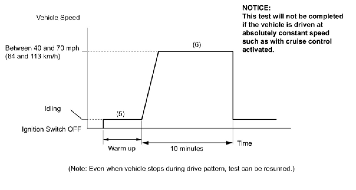 (6) Drive the vehicle at between 40 mph and 70 mph (64 km/h and 113 km/h) for at least 10 minutes.