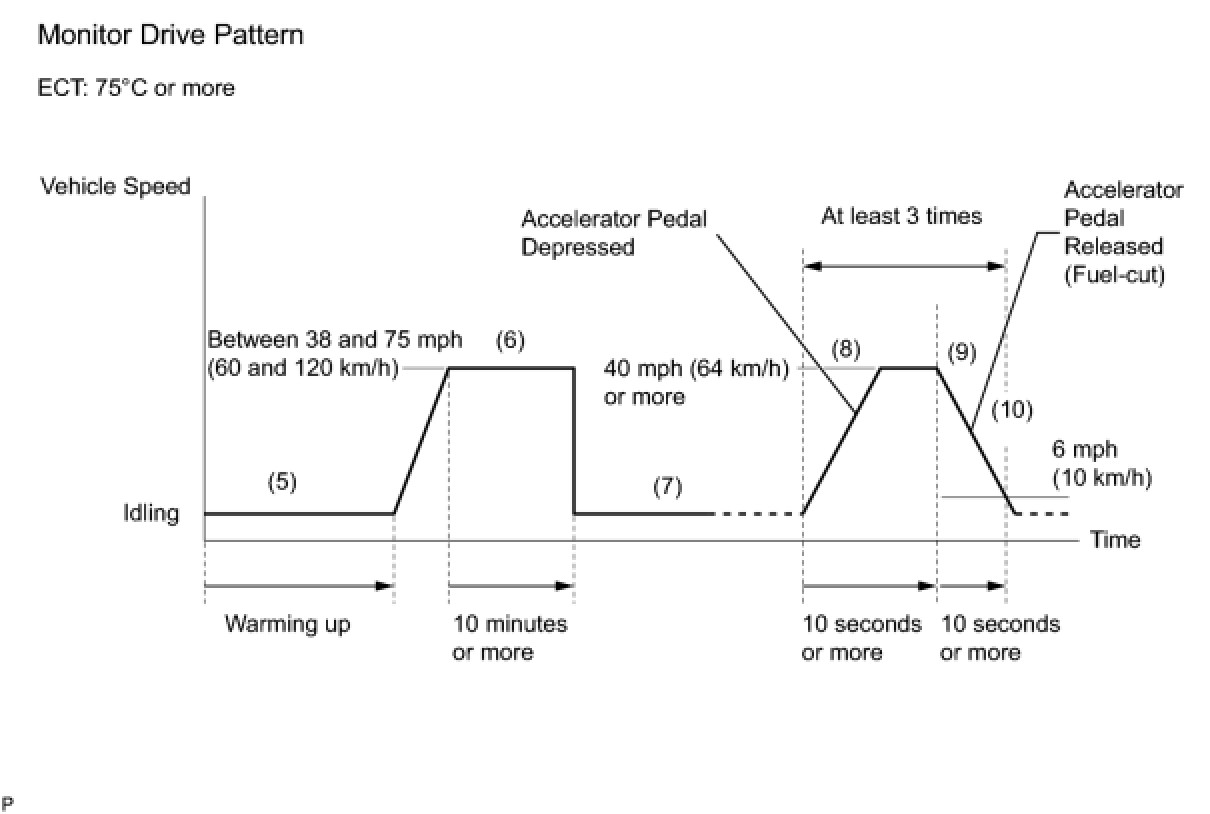 (8) Accelerate the vehicle to 40 mph (64 km/h) or more by depressing the accelerator pedal for at least 10 seconds (Procedure "A").