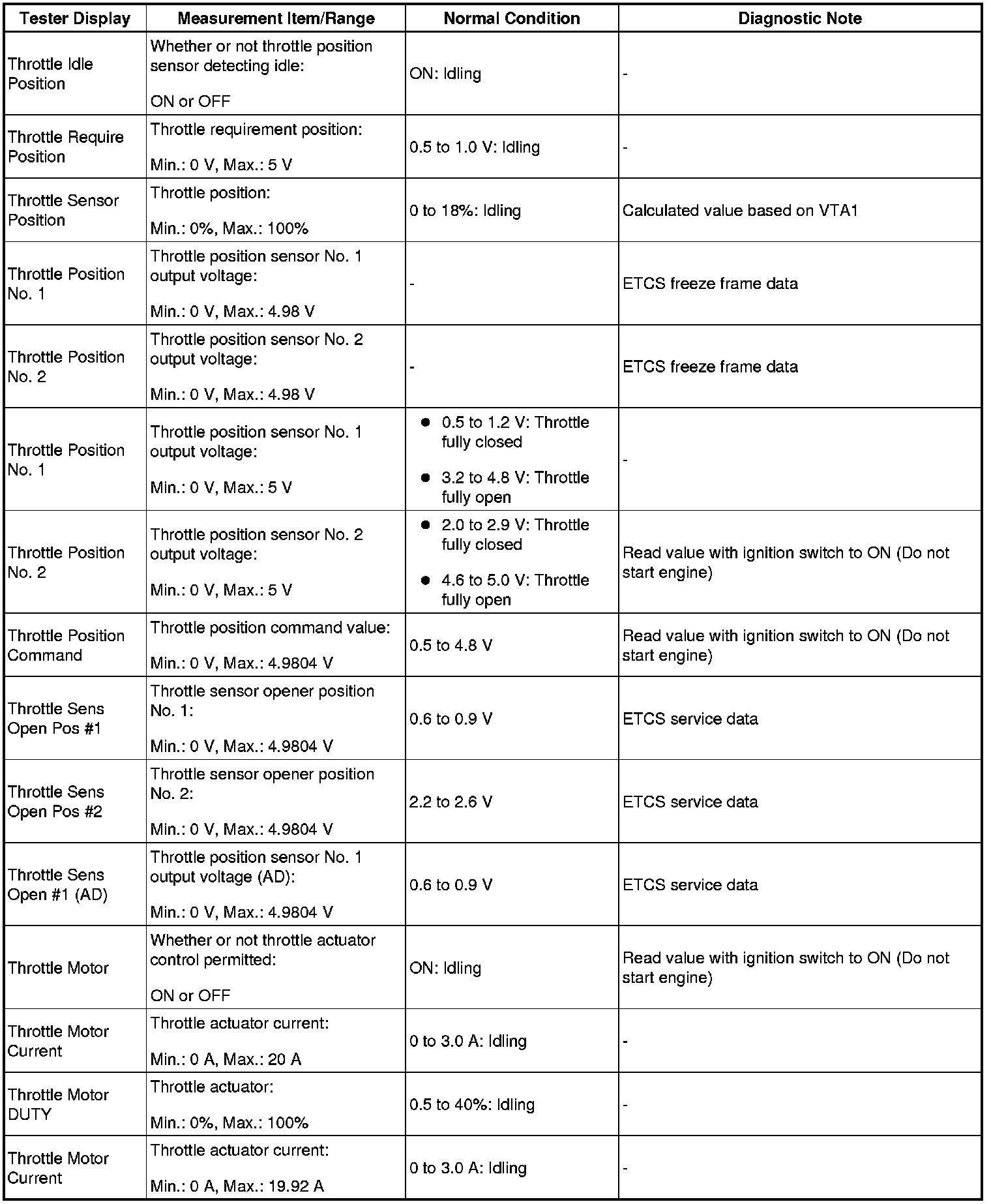 NOTE: In the table below, the values listed under Normal Condition are reference only. Do not depend solely on these values when determining whether or not a part is faulty.