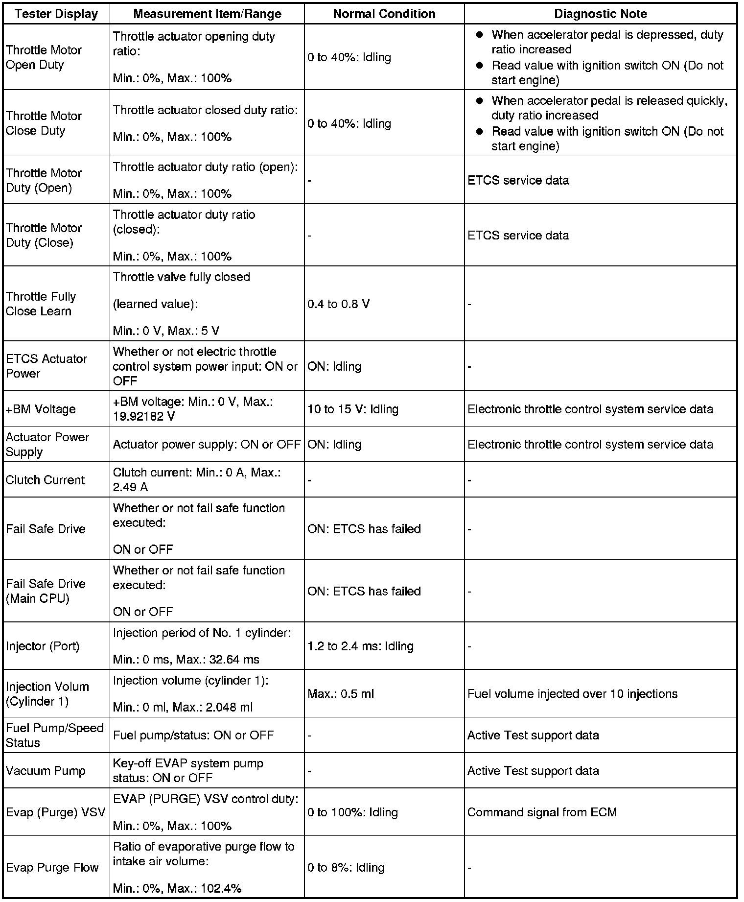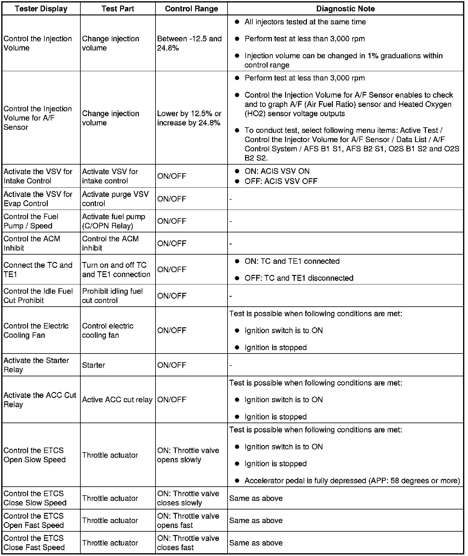 (e) Perform the Active Test by referring to the table below.