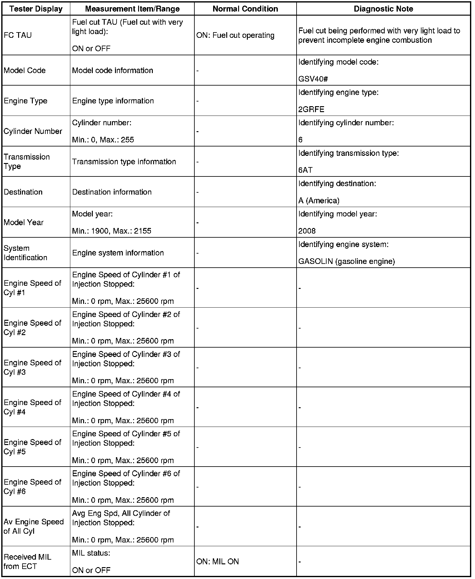 10. Monitor the engine speed (Engine Speed of Cyl #1 to #6, Av Engine Speed of All Cyl) displayed on the tester.