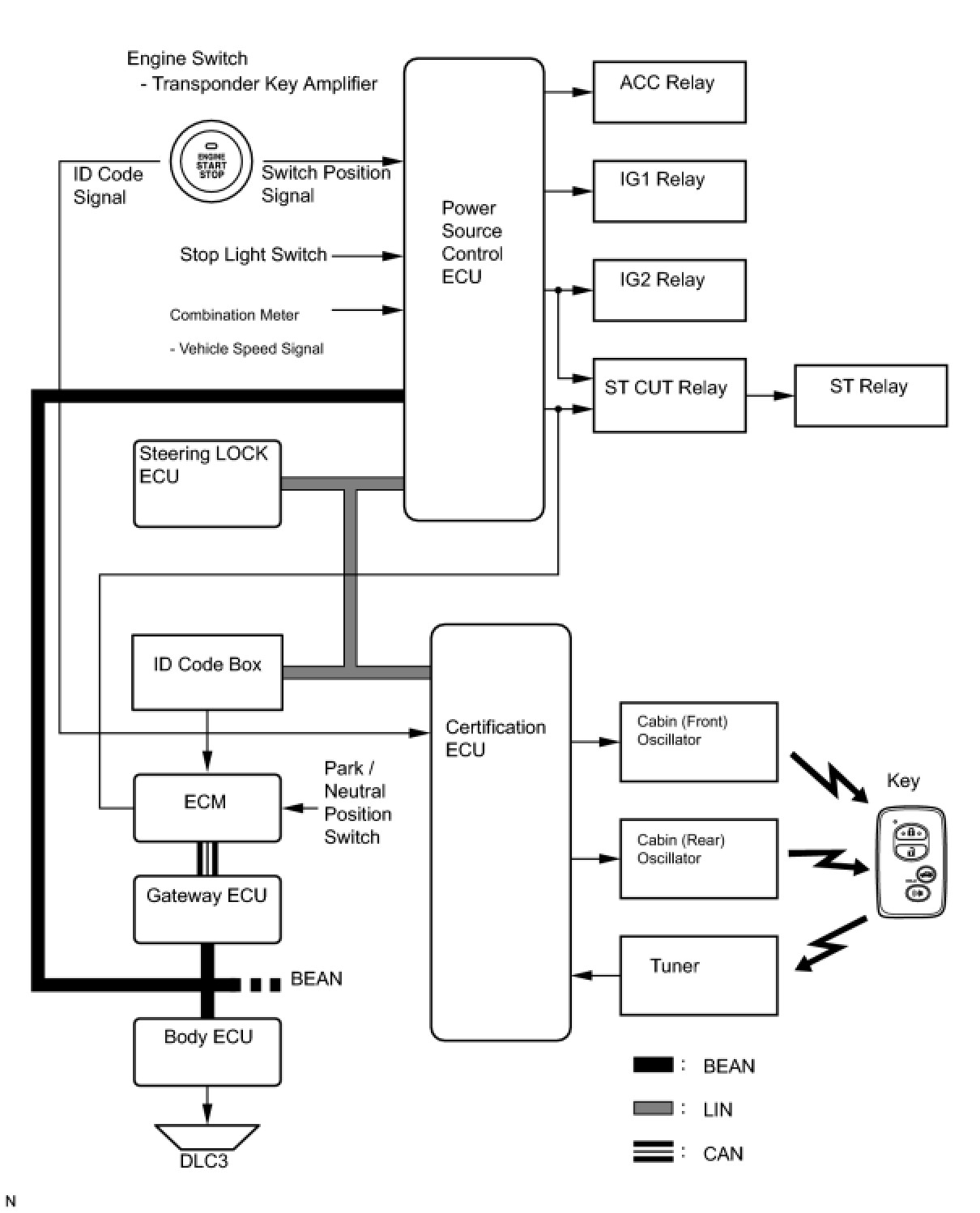 (b) The power source control ECU transmits a key verification request signal from the stop light switch signal to the certification ECU.