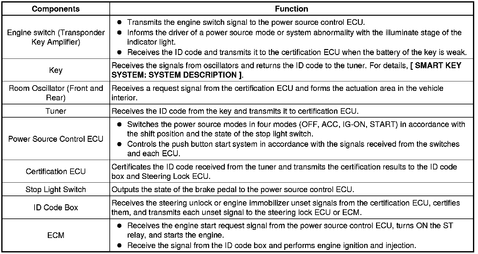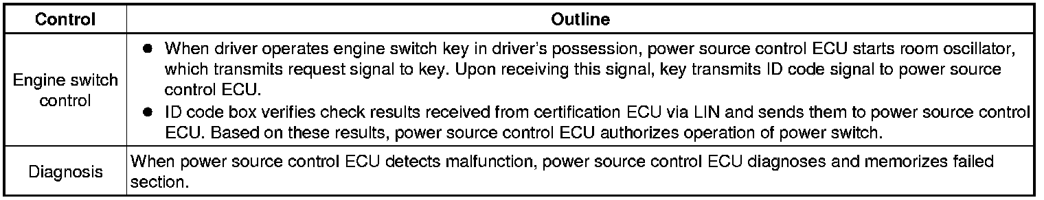 (a) The push button start system uses a push-type engine switch, which the driver operates by merely carrying the key. This system consists primarily of the power source control ECU, engine switch , ID code box, steering lock ECU, key, ACC relay, IG1 relay, IG2 relay and certification ECU. The power source control ECU controls the system. This function operates in cooperation with the smart key system.