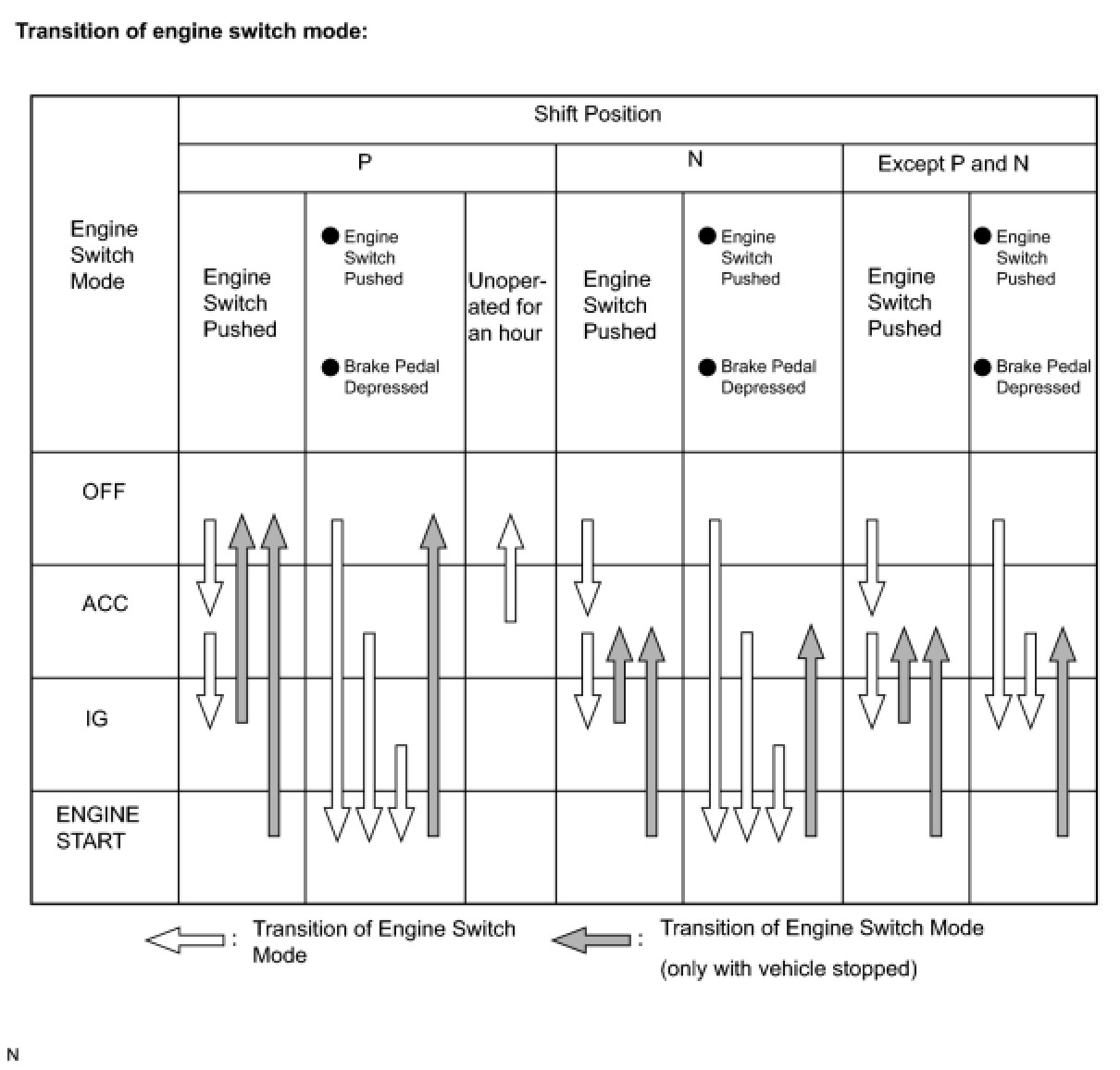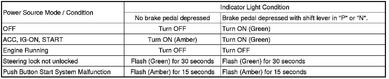 The table below shows the transition of the engine switch, which depends on whether the brake pedal is depressed or released.