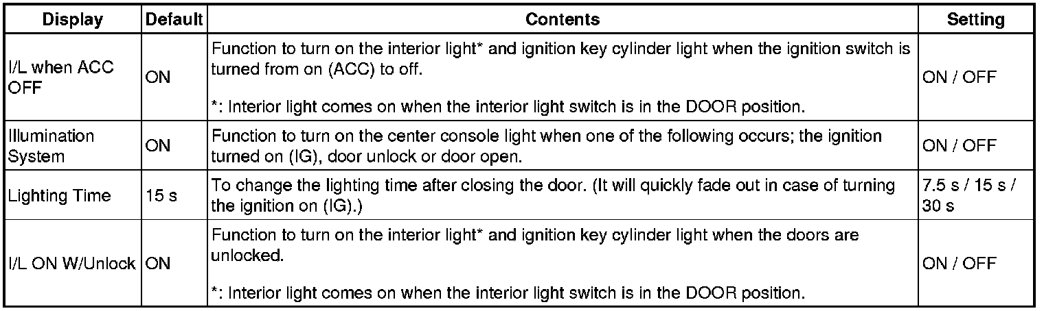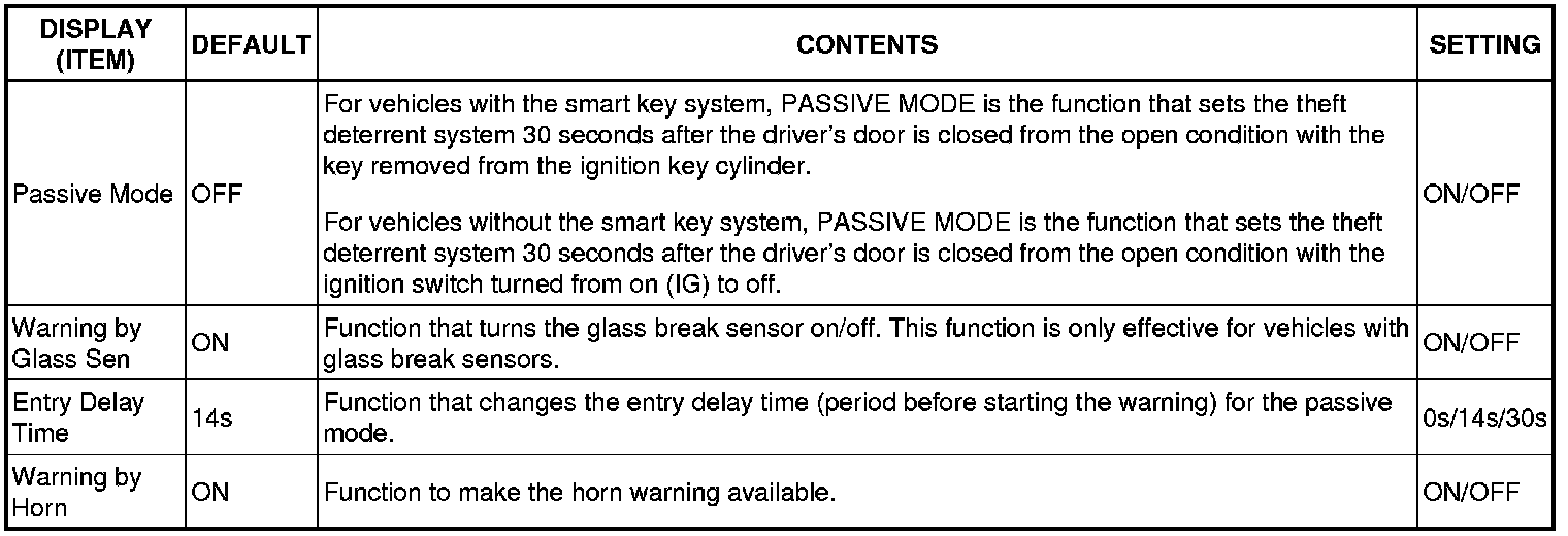 (*1): This function cannot be turned on or off if the security system is turned off.