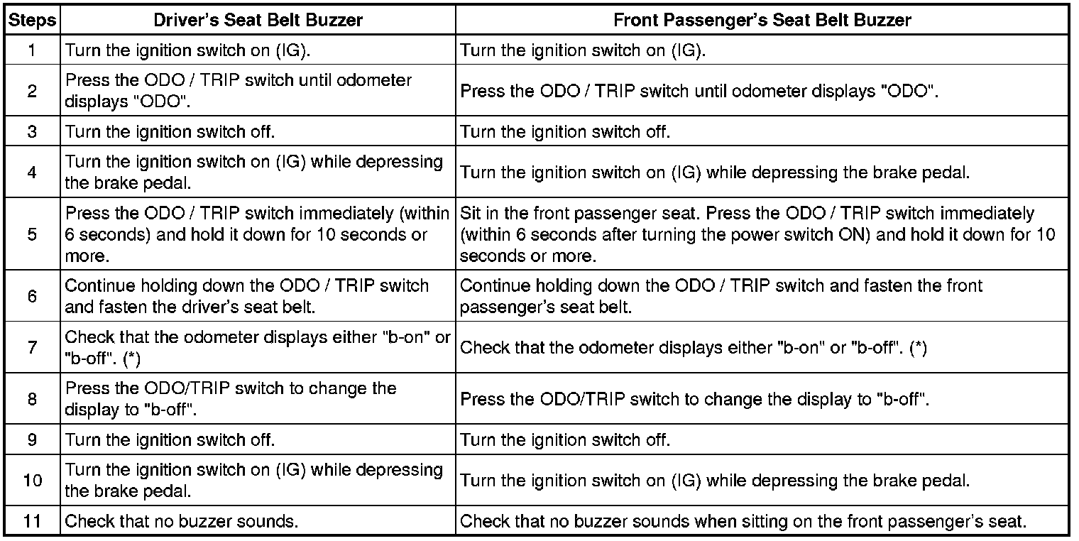 *:"b-off" indicates that the buzzer is OFF. "b-on" indicates that the buzzer is ON. The buzzer ON / OFF setting will be finished (the odometer will display "ODO") if the ODO / TRIP switch is not operated for 10 seconds or more. In this case, perform step 11 to check that buzzer ON / OFF setting is complete. If it is not complete, start from step 1 again.
