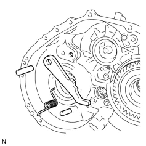 NOTE: Make sure that one end of the spring is fixed in the hole of the transaxle case and the other end is positioned on the parking lock pawl as shown in the illustration.