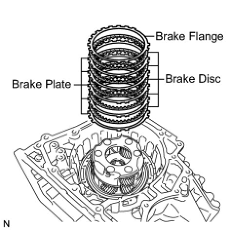 (a) Install the 5 brake discs, 5 brake plates, and brake flange to the transaxle case.