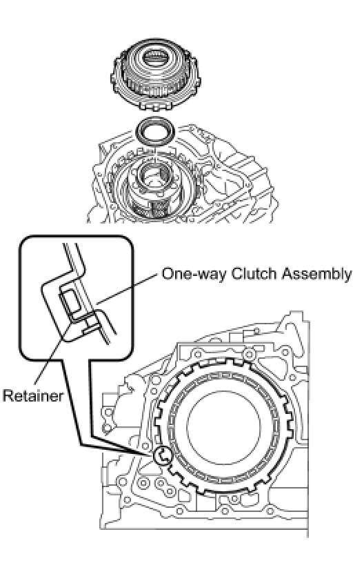 NOTE: Make sure that there is no clearance between the retainer and the claw on the one-way clutch assembly. If there is any clearance, the spring of the retainer will be deformed.