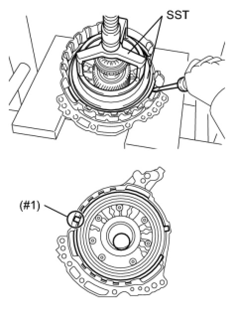 (b) Place SST on the 1st and reverse brake return spring and compress the 1st and reverse brake return spring with a press.