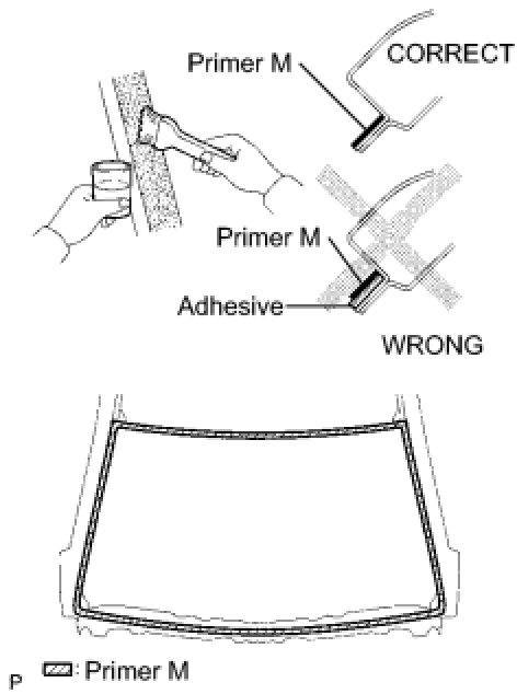 (b) Using a brush, coat the exposed areas of the vehicle body, where all adhesive has been removed with Primer M.