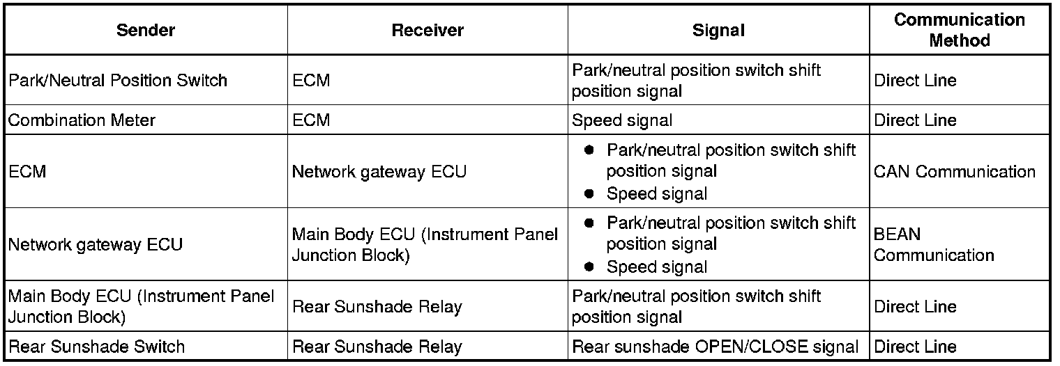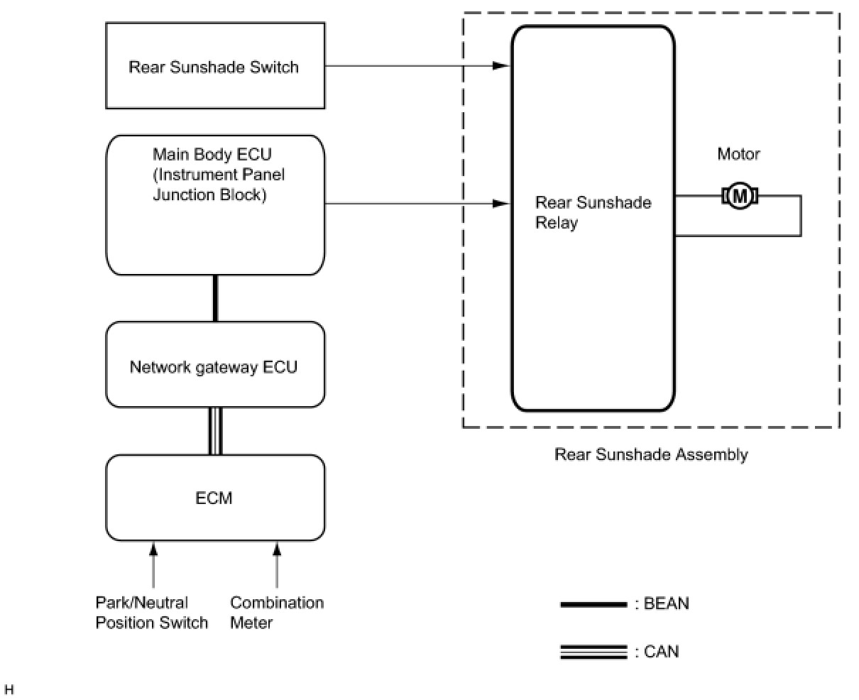 (b) When the shift lever is moved to the R position while the ignition switch is on (IG), the ECM receives a reverse position signal from the park/neutral position switch. After receiving the signal, the ECM sends it to the network gateway ECU via CAN communication. The network gateway ECU sends the signal to the main body ECU via BEAN communication. After receiving the signal, if the rear sunshade is raised, the main body ECU turns on the rear sunshade relay to lower the rear sunshade.