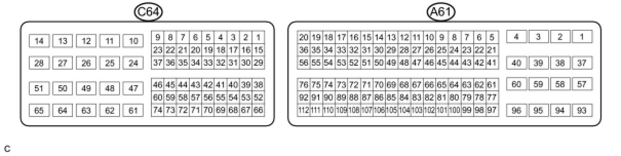 HINT: The standard normal voltage between each pair of the ECM (included in the hybrid vehicle control ECU) terminals is shown in the table below. The appropriate conditions for checking each pair of the terminals are also indicated. The result of checks should be compared with the standard normal voltage for that pair of the terminals, displayed in the "Specified Condition" column. The illustration above can be used as a reference to identify the ECM terminal locations.