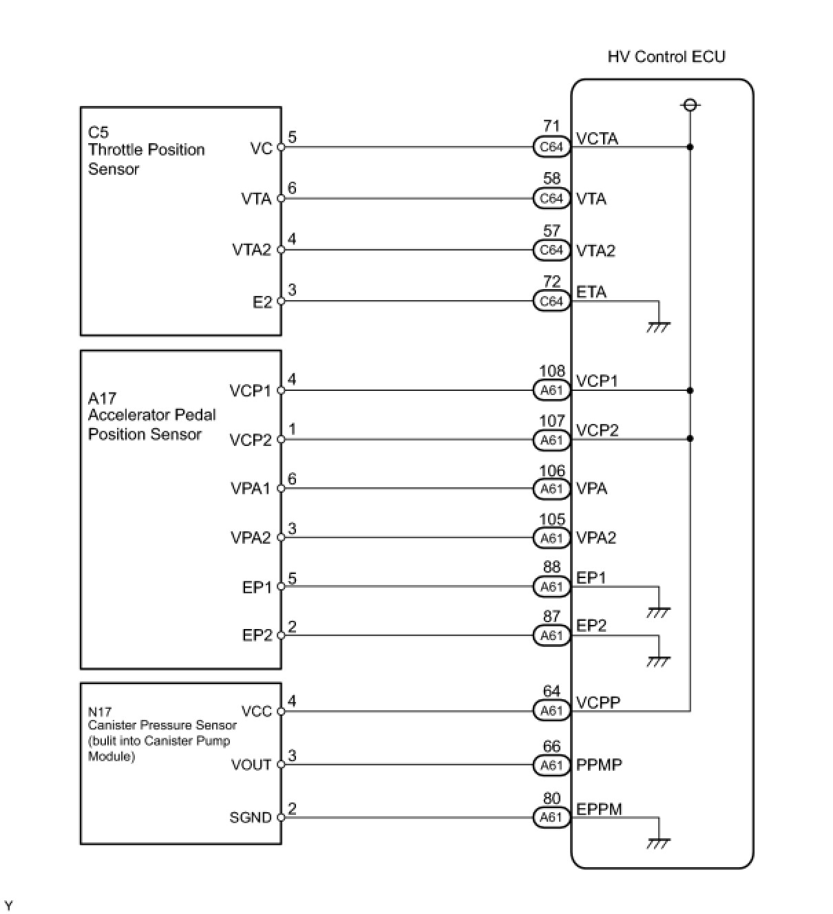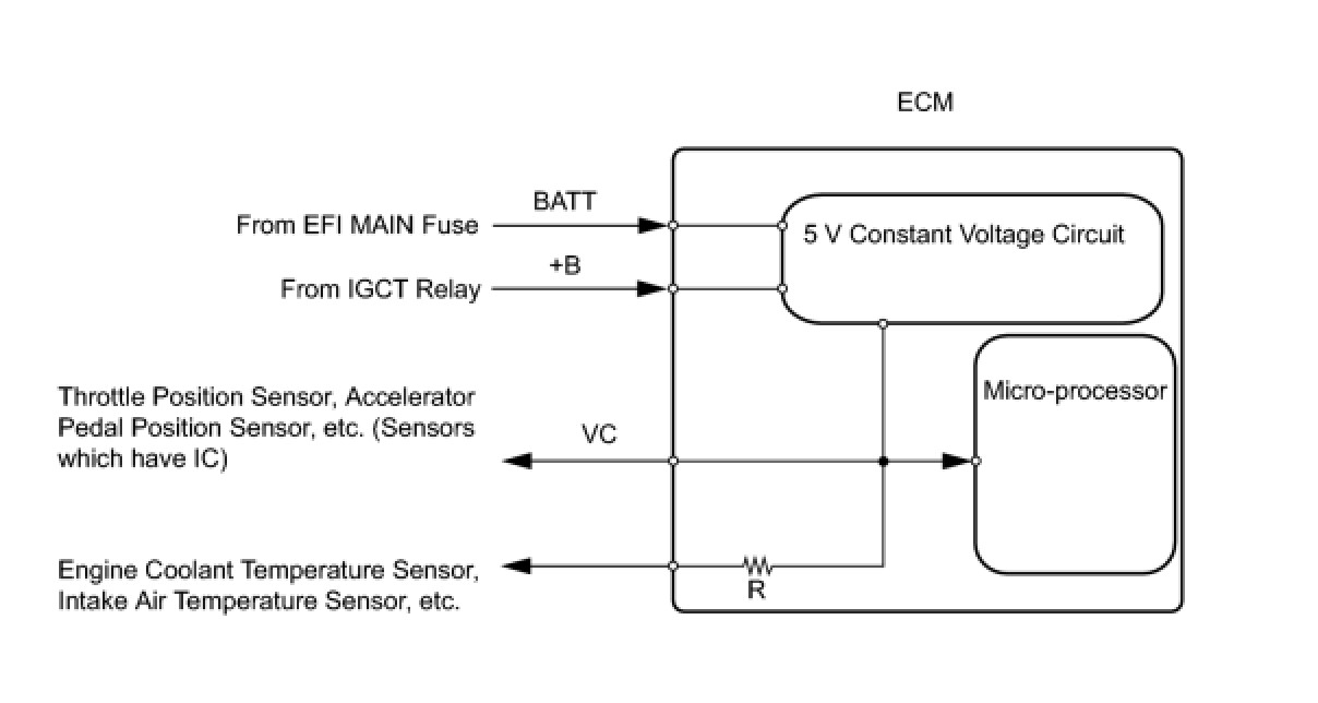 The ECM (Included in the hybrid vehicle control ECU) constantly generates 5 V power from the battery voltages supplied to the +B (BATT) terminal to operate the Micro-processor. The ECM also provides this power to the sensors through the VC output circuit.